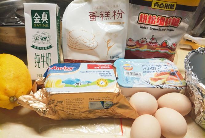 【主要材料】:奶油乳酪105克,牛奶40克,蛋白100克,蛋黃30克,低筋麵粉30,細砂糖30,黃油20克,檸檬汁或白醋幾滴。