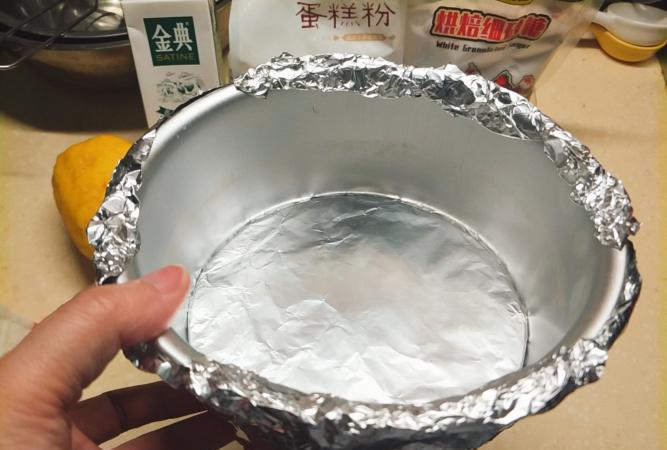 第二步:模具底層需墊一張錫箔紙,方便脫模,內側周圍不要墊,而是用黃油塗抹,方便蛋糕烘烤過程中爬高。我家的是活底模,還需在模具外再包一層錫箔紙,防止水流入模具裡,因為用的是水浴法。建議包兩層更保險,我在烘烤前又裹了一層。