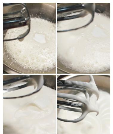 第六步:開始打發蛋白,分三次加入細砂糖,先在蛋白盆裡加入檸檬汁或白醋幾滴,目的是去除蛋腥味以及穩定打發蛋白的狀態。用電動打蛋器高速打發到成魚眼泡時加入三分之一糖;再繼續打發到密集泡沫時加入三分之糖;轉為中速打發到出現紋路時再加入剩下的糖,繼續打發到提起打蛋器出現彎曲的尖角時就可以了,此時是中性偏溼的狀態。