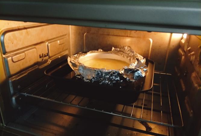 第八步:用水浴法烘烤,準備一個深烤盤,裝入溫水,再將模具放入深烤盤裡面放入預熱好的烤箱中下層。水量到模具的三分之一處即可。烤箱130度50分鐘左右,再調高溫度到140,繼續10到20分鐘的上色烘烤。