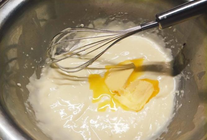 第四步:攪拌到牛奶和奶油芝士無顆粒,光滑細膩的狀態,再加入黃油繼續攪拌,黃油無需提前軟化。