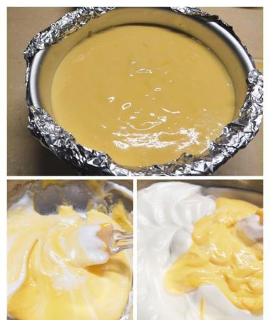 七、蛋白打發好和乳酪液混合時,一定要注意翻拌的手法,不能畫圈,要像炒菜一樣,不然會消泡,影響蛋糕長不高。