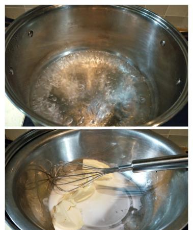 第三步:用蒸鍋燒開水,關火,再將裝牛奶和奶油芝士的盆放在蒸鍋上面,這樣隔水加熱攪拌。